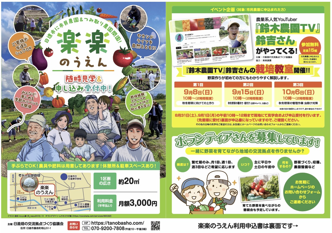 『楽楽のうえん』は愛知県日進市にある市民農園(貸し農園)と野菜づくりサークルを運営している農園です。